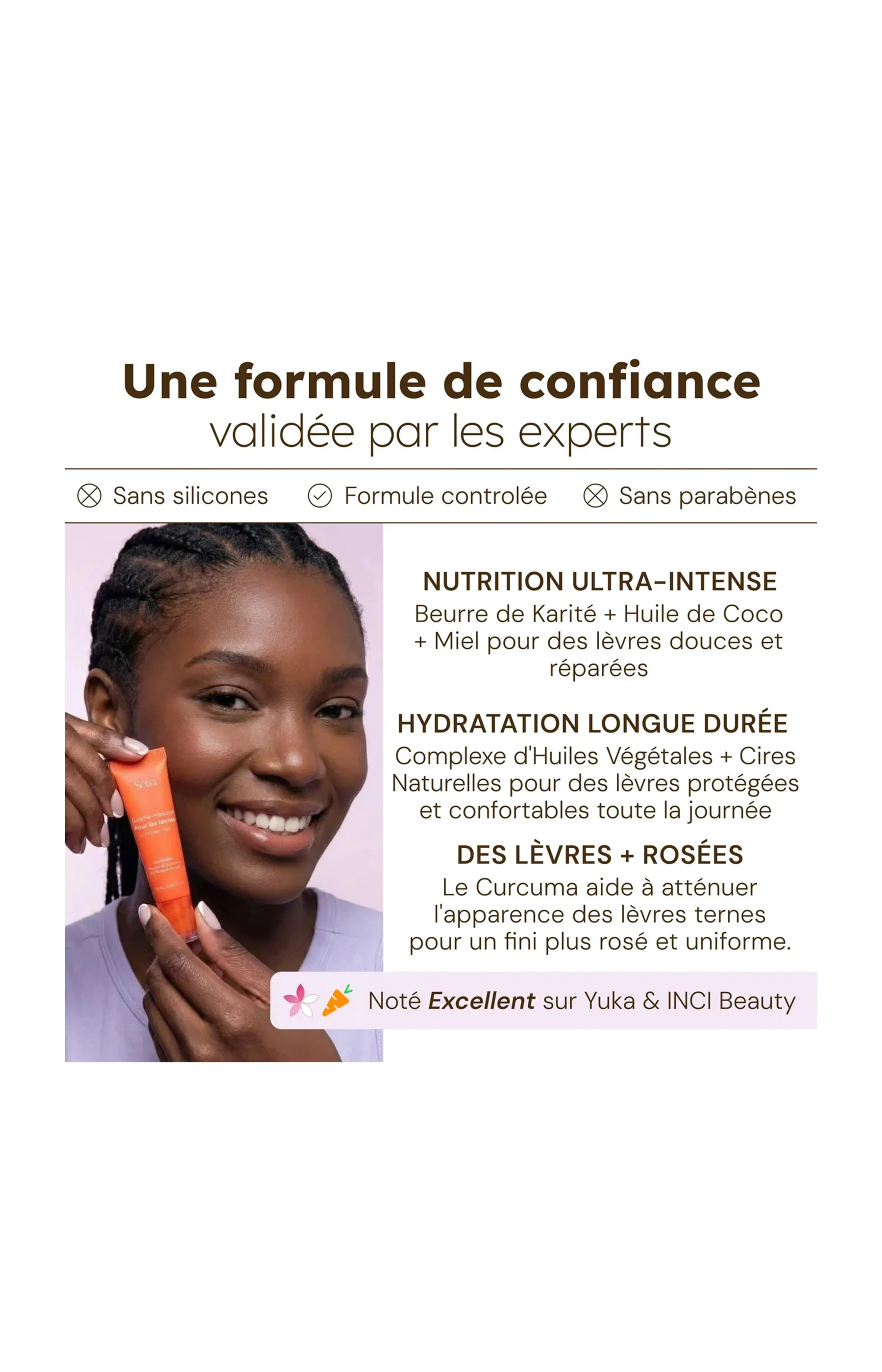 Découvrez ce baume à lèvre masque, il atténue les gerçures et redonne douceur et souplesse. Il nourrit intensément et donne de l'éclat aux lèvres grâce à sa composition à l'huile de coco, beurre de karité, curcuma et miel.